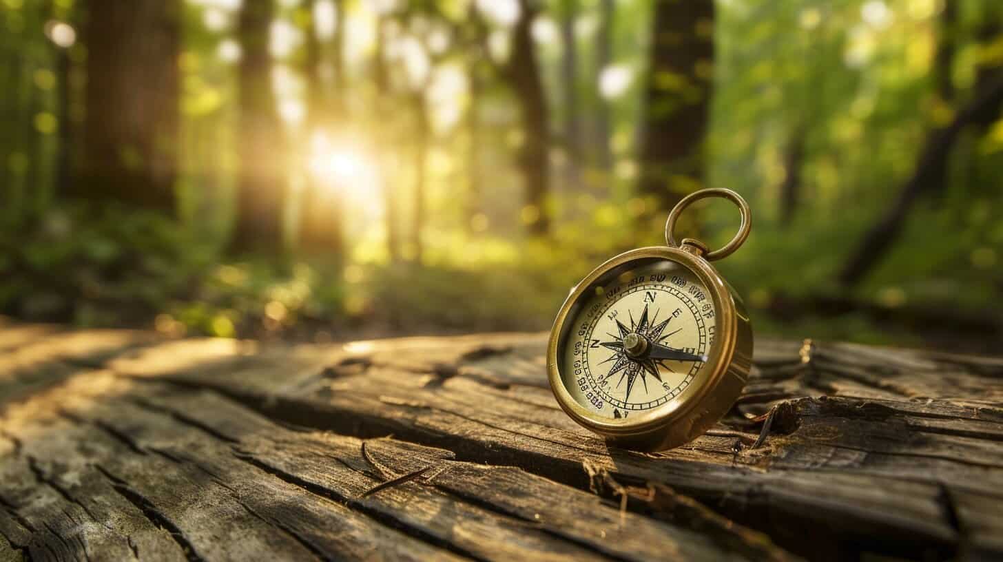 image features a brass compass resting on a weathered wooden surface with soft light filtering through a forest in the background The image conveys direction clarity and guidancecore elements of The Catalyst Centers collaborative trauma specialist psychological evaluation services