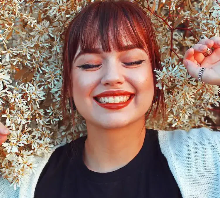 woman laying in flowers smiling