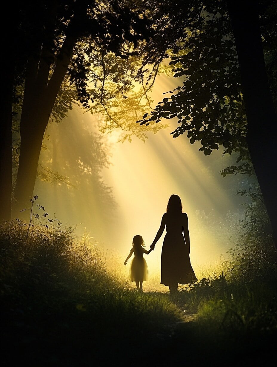 This symbolic image shows a woman gently holding hands with her younger translucent self in a dreamy golden lit setting It represents reconnecting with the inner child healing attachment wounds and the tender journey of self compassion Perfect for blogs about Mother Hunger reparenting or childhood emotional neglect