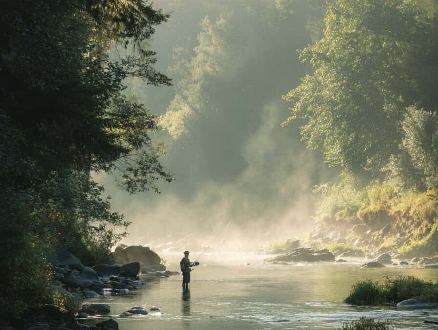 A contemplative portrait of a fly fisherman emphasizing body awareness stillness and mindful presence The image reflects somatic grounding sensory awareness and the quiet rhythms of mindful fly fishing in nature