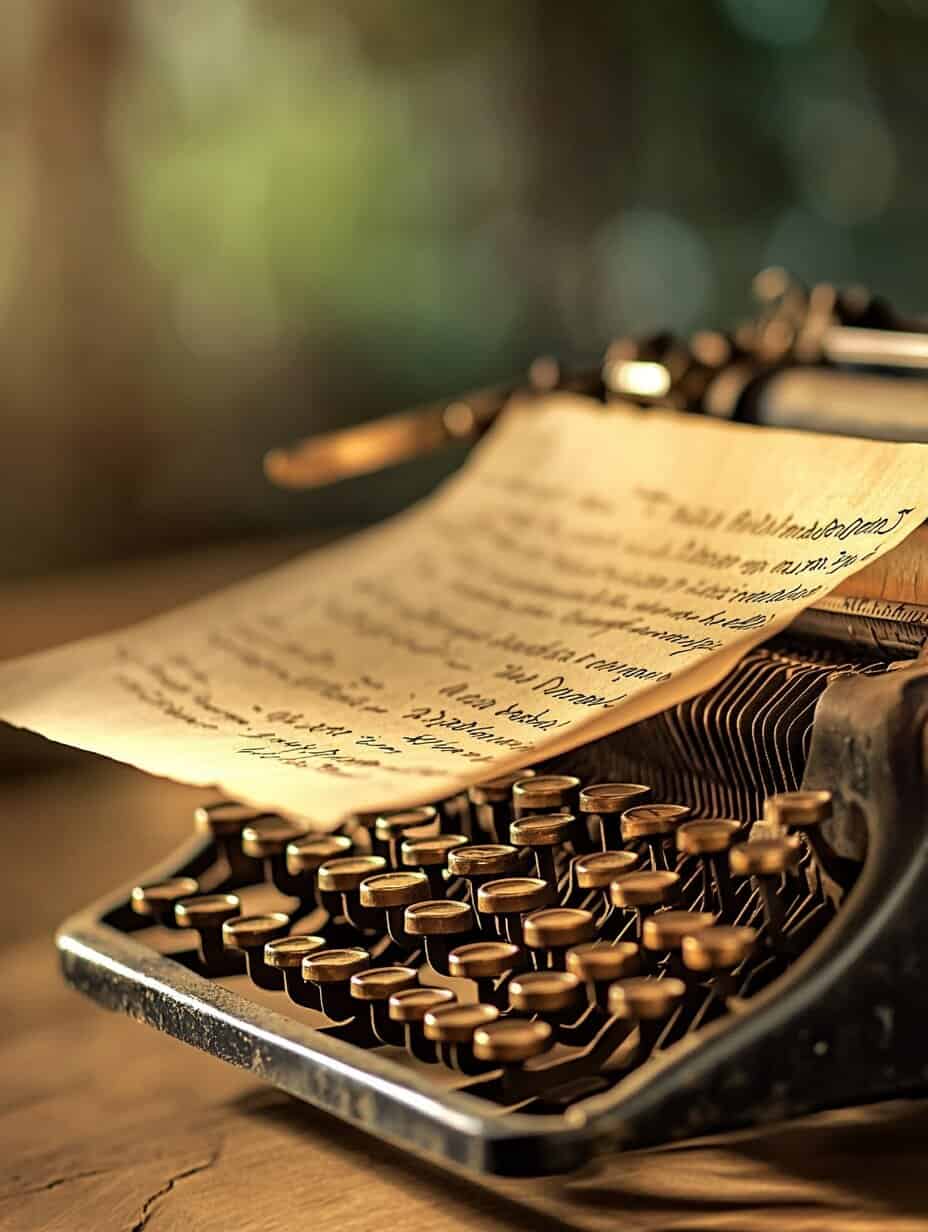 A symbolic image of a vintage typewriter with fading or blurred words on the page captured in warm soft lighting Represents the theme of internal narratives limiting beliefs and the process of rewriting old stories Perfect for blogs exploring personal growth identity mindset shifts or therapeutic transformation