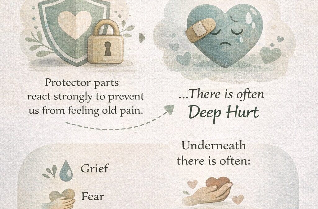 Infographic illustrating how trauma and emotional neglect affect intimacy, showing protective “parts” and the deeper emotional pain beneath, inspired by Internal Family Systems (IFS) therapy.